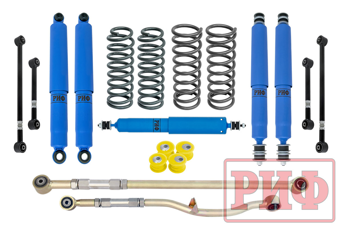 Кроме того, амортизаторы с технологией R-AIR повышают устойчивость к высоким нагрузкам. Все элементы лифт-комплекта РИФ разработаны специально для тяжелых условиях эксплуатации внедорожников и отлично справляются с любыми дорожными покрытиями.